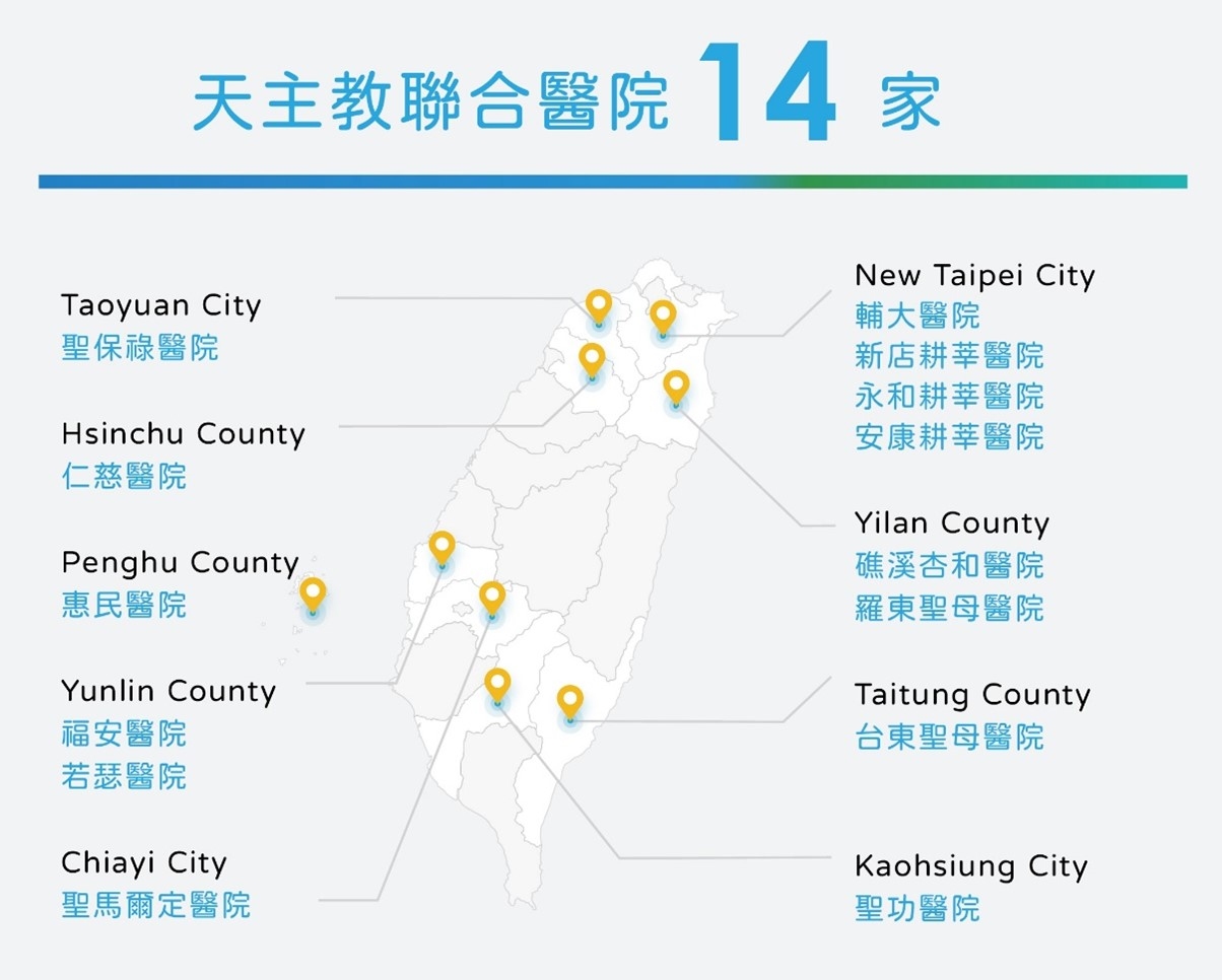 天主教健康照護聯盟共有10家醫院一同參加「2025台北國際照顧博覽會」,包括輔大醫院*、新店耕莘醫院*、永和耕莘醫院*、耕莘醫院安康院區、聖功醫院*、聖馬爾定醫院*、仁慈醫院*、羅東聖母醫院*、礁溪杏和醫院以及澎湖惠民醫院。(標誌*的7家甫獲得「健康台灣深耕計畫」補助)