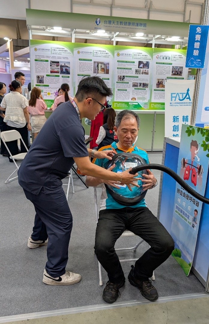 這次的國際照顧博覽會,輔大加速器帶領10家輔導企業一同展出,包括傑精靈 (非接觸式生理體徵量測)、玖顧(高CP值負壓呼吸器)、家天使(台灣最大看護媒合平台)、多扶(無障礙交通與樂齡旅遊)、望鼎(HEHO健康網)、銀和繫(樂齡程式系統)、崇恩集團、倍思親護具、森康食品素雞精、唯豐養生粥。